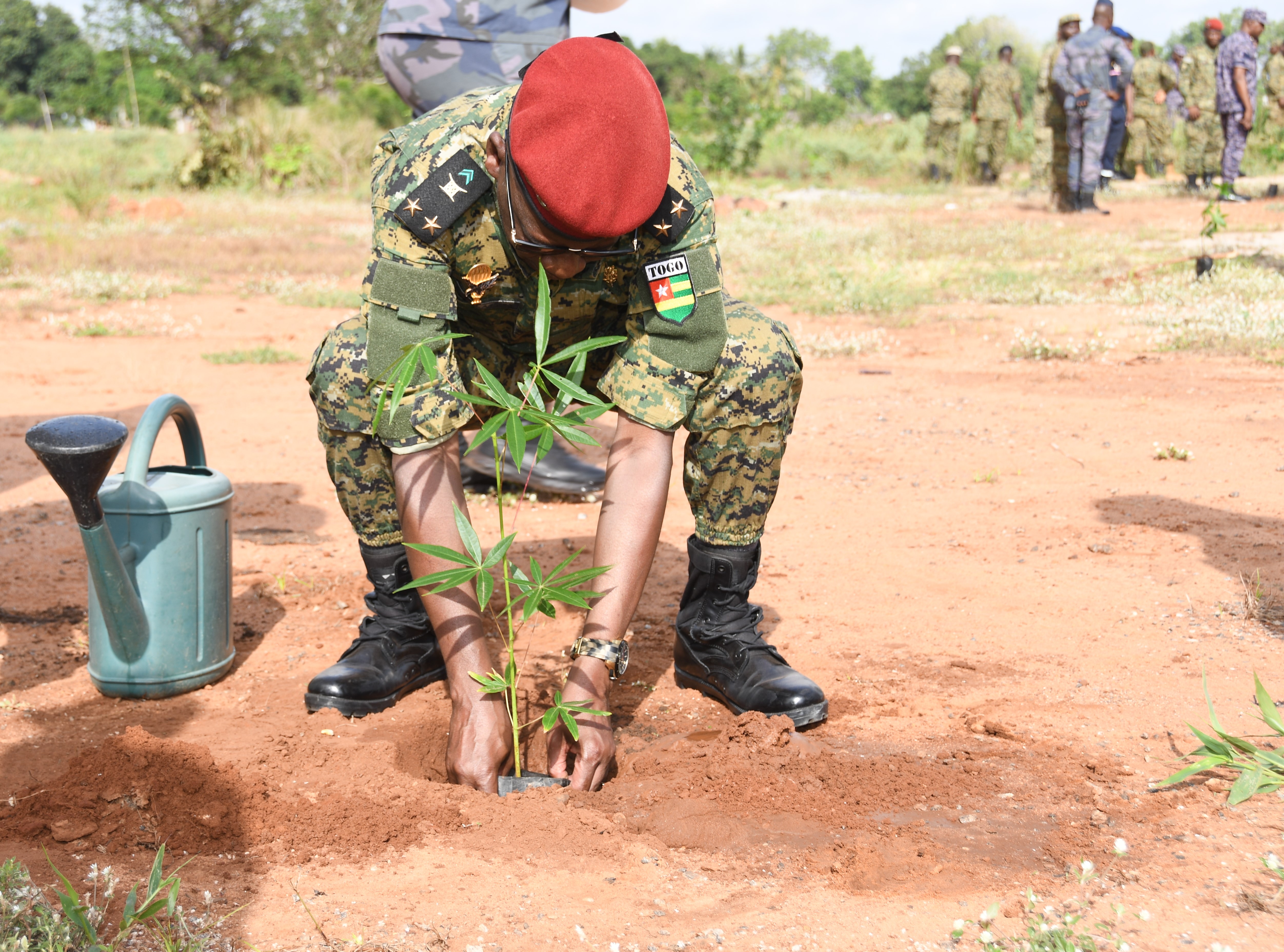 Officiers, sous-officiers et militaires de rang ont ensuite emboîté le pas, mettant en terre plus de 500 jeunes plants ( eucalyptus, acacias, kapokiers, neems ) le long de la clôture sud et à l’intérieur de l’état-major.