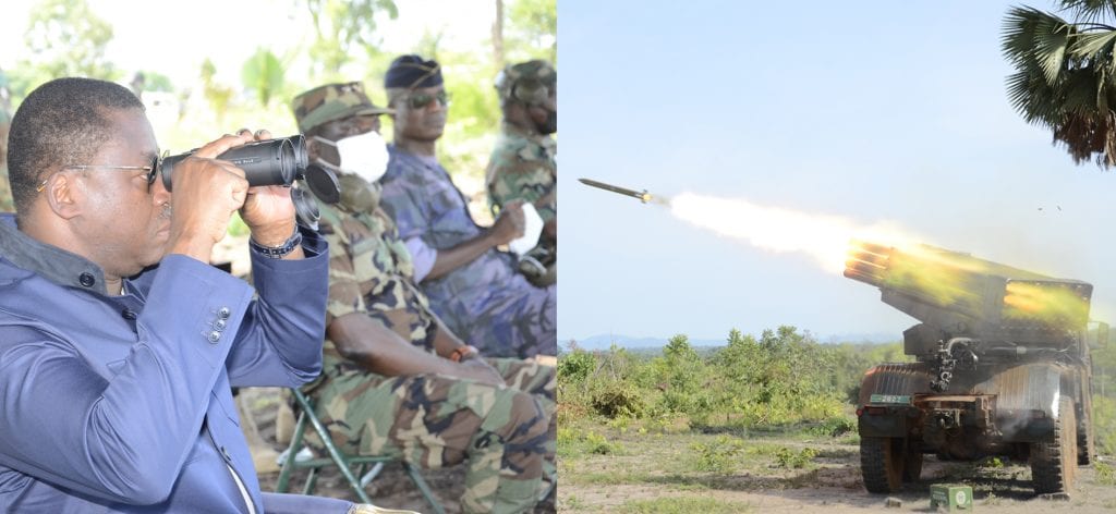 Le Président de la République, chef des Armées a assisté ce vendredi 28 mai 2021 à la campagne de tir aux armes lourdes au champ de tir d’Akaba dans la préfecture de l’Akébou.