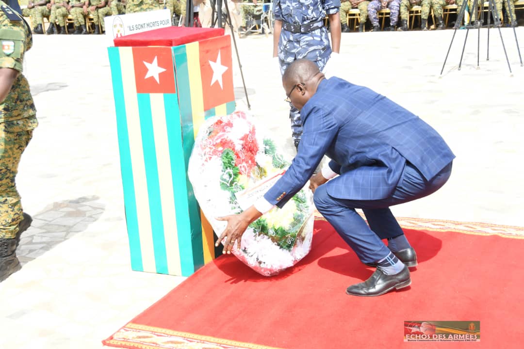 Des prières ont ensuite été dites par les aumôniers catholique et musulman pour le repos des âmes des soldats tombés, le prompt rétablissement des blessés et le réconfort des familles endeuillées. Dans cette même logique, le Ministre de l’Administration territoriale, de la Gouvernance locale et des Affaires coutumières, M. Awaté Hodabalo, a procédé au dépôt de gerbes en hommage aux militaires disparus.