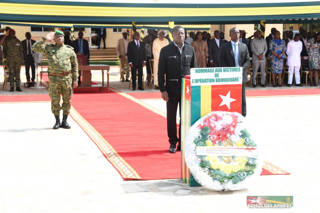 La Nation togolaise a rendu, samedi 24 janvier 2026, un hommage solennel aux militaires tombés au champ d’honneur, aux blessés et aux auteurs d’actes de bravoure dans le cadre de l’Opération Koundjouaré, lors d’une cérémonie organisée au Régiment Parachutiste Commando (RPC) à Kara. La cérémonie a été présidée par le Président du Conseil, Son Excellence Monsieur Faure Essozimna GNASSINGBE, Chef Suprême des Armées, en présence de plusieurs autorités politiques, administratives, coutumières, religieuses, militaires ainsi que des familles et proches des victimes.
